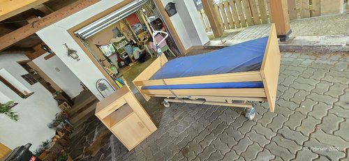 Pflegebett mit Spezialmatraze und Nachtkasten sowie Bettaufrichter